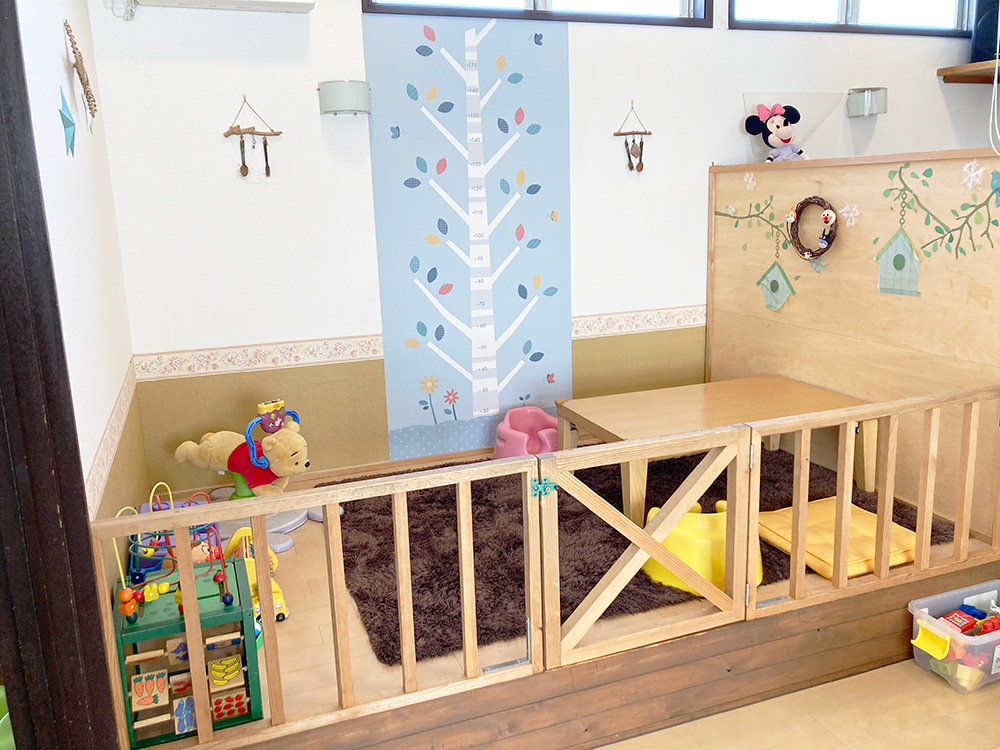 おもちゃはたくさんあるので、どのお席でも楽しく遊んでいただけると思います。ご予約をいただいた際はお子さまの月齢・年齢をお聞きし、その月齢・年齢にあったおもちゃをテーブルの近くに配置するように準備しています。一部の席にはロールカーテンを取り付けているので、授乳も気兼ねなくしていただけます。柵で区切られた席や個室がある店舗はなかなかないと思うので、便利に利用していただければと思います。
