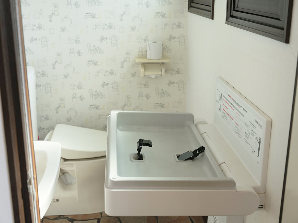 トイレにはおむつ交換台があります。まだお座りが難しいお子さま向けにはバウンサーやクーファン、バンボの用意もあるので、抱っこに疲れても安心してお食事が楽しめますね。