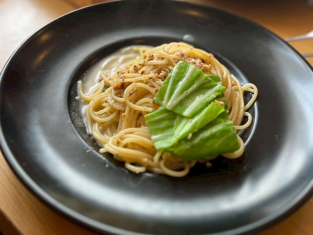 パスタは、ジェノベーゼ、アーモンドとピスタチオのスパゲティ、明太子クリームスパゲティ、濃厚カルボナーラ、トマトクリームスパゲティ、キノコと大根おろしの和風スパゲティの6種類の中から選べます。今回はアーモンドとピスタチオのパスタを注文しました。