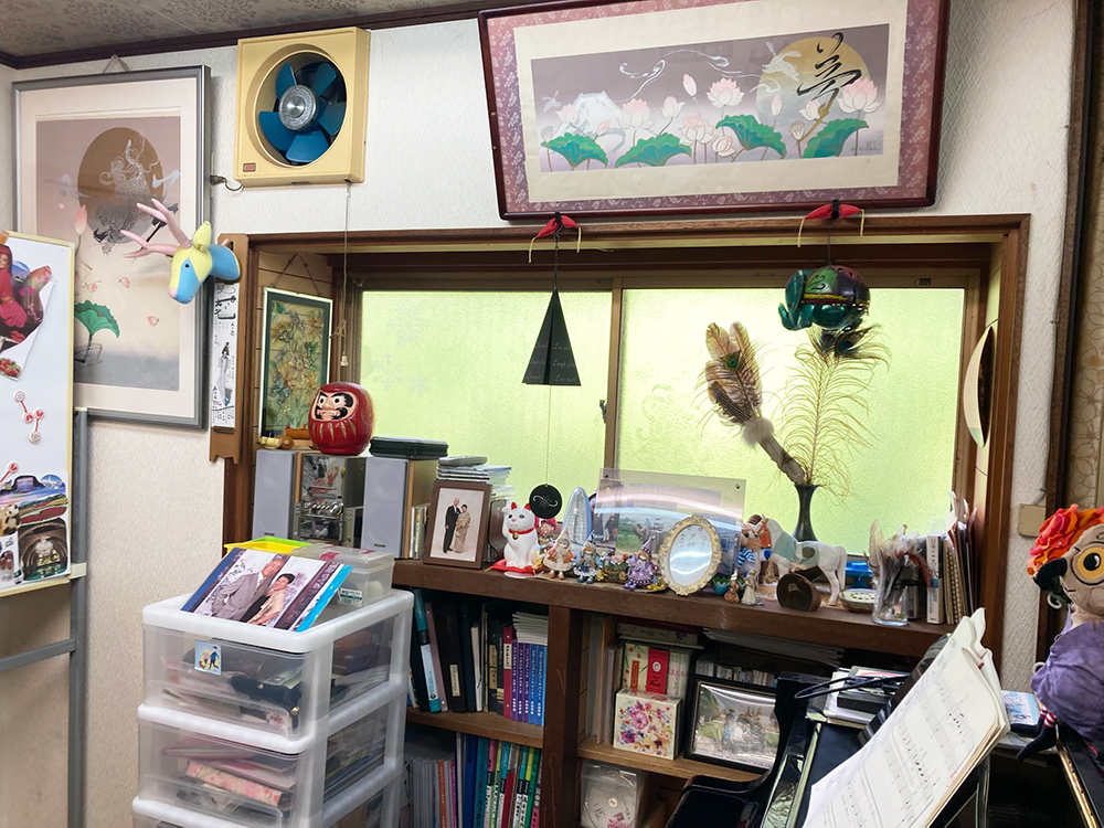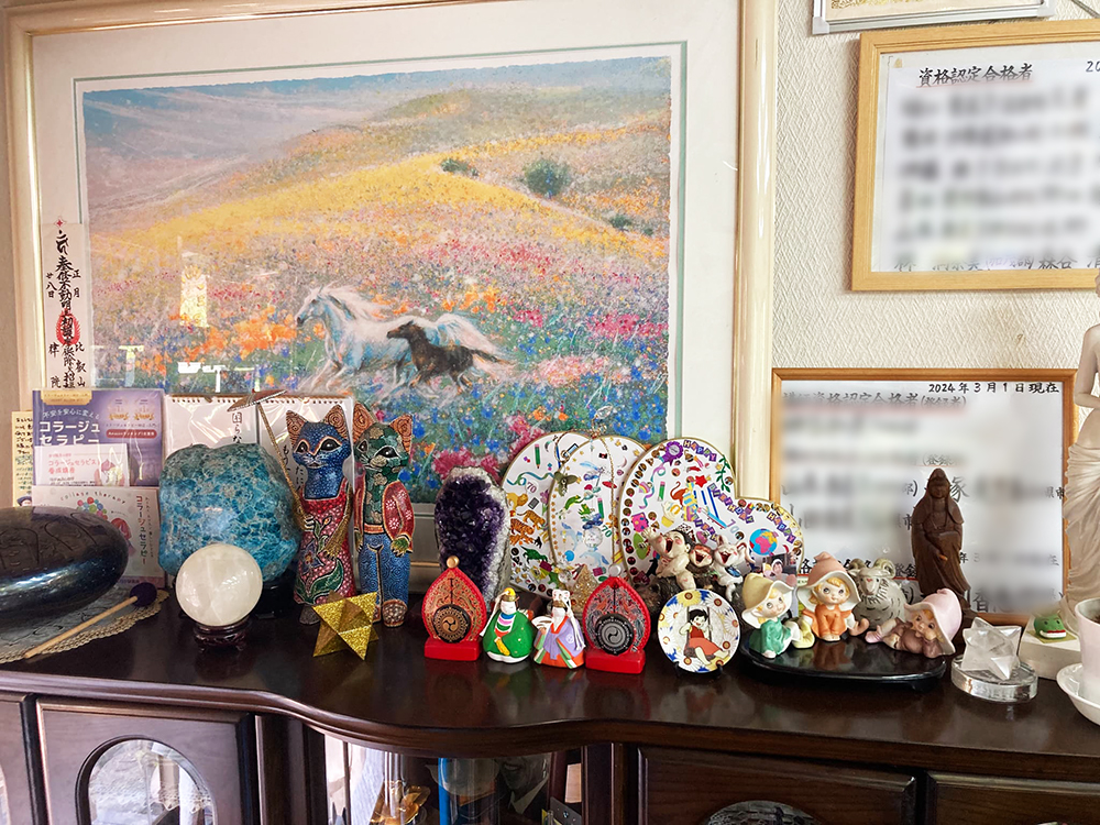海外を旅した時に、前世はシャーマンや牧師だったと言われた水谷さん。ご利益がありそうなものもたくさん置かれています。ボランティアでミュージカル劇団の『とんちんかん劇団』もやられているとのことで楽器もありました。著作も並んでます。