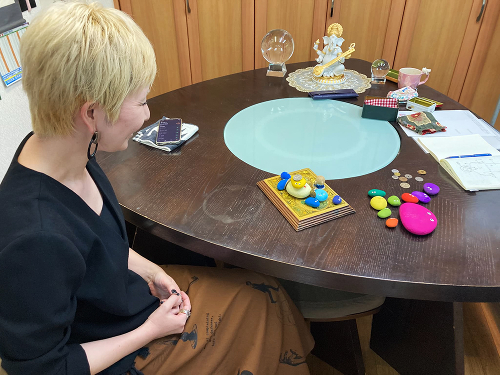 少しお茶しながらお話しした後セッション開始。まずは水谷さんを紹介してくれたMちゃんのセッション。今回Mちゃんが体験したのは、水谷さんが最近考案された『アメイジングセッション』です。可愛らしい石とコインを使ったコラージュです。