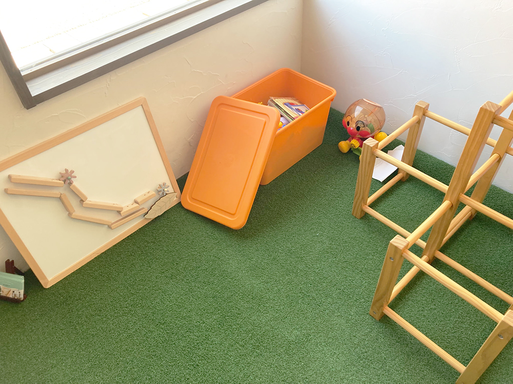 このプレイスペースは、子連れのお客さまのお子さまが暇そうにしていたので、作ってみたら面白いかもということで試しに置いてみたらとても喜ばれて、そのまま定着しました(笑)。