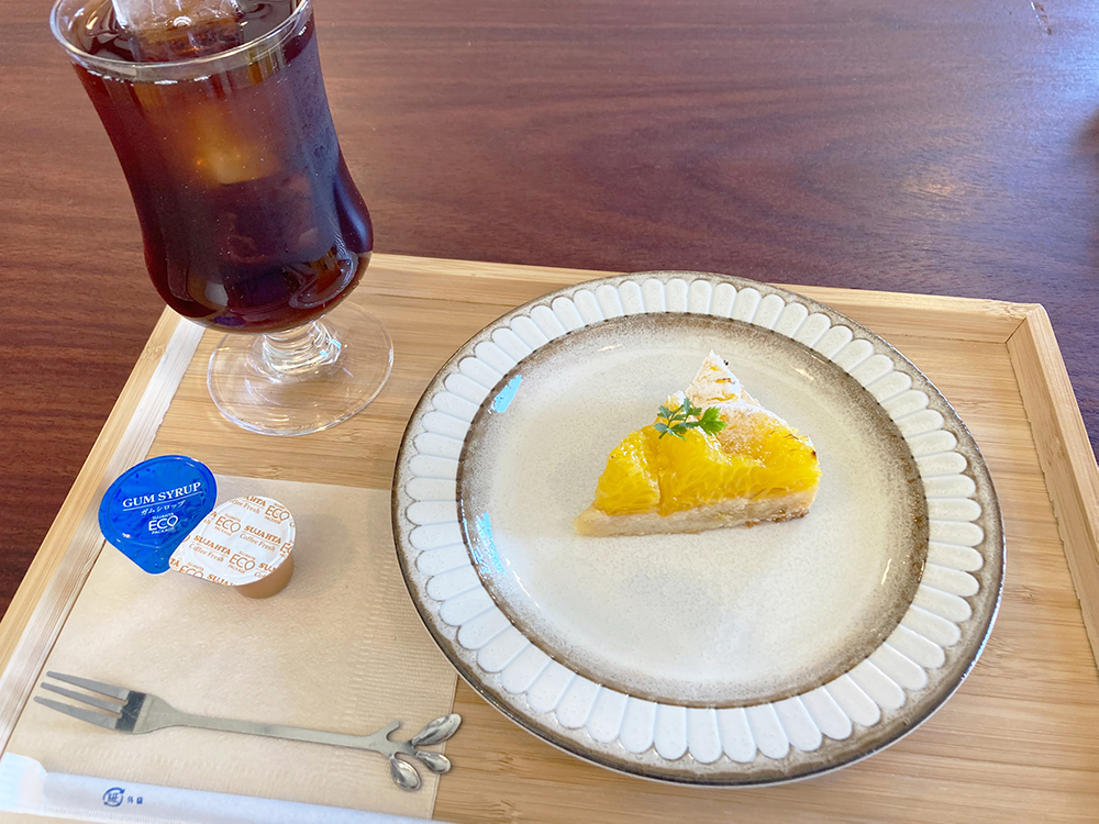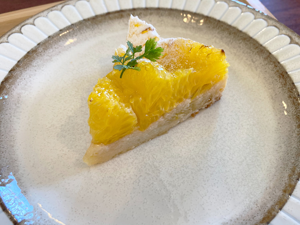 ランチが到着です!野菜がたっぷり!これは栄養バランスもよさそうですね。生野菜は新鮮でシャキシャキでした。デザートは『菓子処かしの』さんの八朔のタルトです。八朔のさわやかな酸味とほろ苦さが大人の味でした。