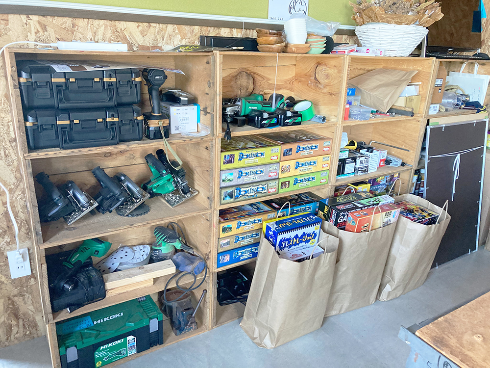 お店の奥には、友田工務店の運営ならではのプロ用の電動工具やレーザー加工機が揃っている工房があります。工房の真ん中には広い作業台があり、人を集めて工作系のワークショップも開けます。家でやるにはちょっとハードルが高いDIY作業もここでなら気兼ねなくできそうですね。現役の大工さんがモノづくりを教えてくれるイベントが開催されることもあるようですよ。