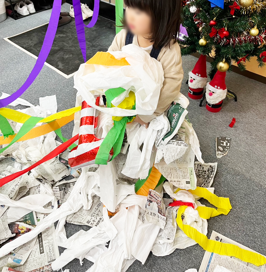 - カラフルなテープや新聞紙を使って、自由に引っ張ったりちぎったりする遊び
