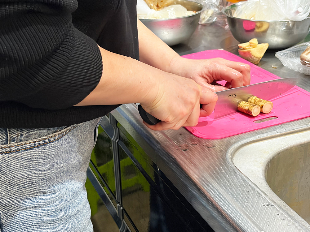 この日はインフルエンザの流行で3人キャンセルが出てしまいマンツーマンに。和やかに、時にはまついさんの熱い語りで進んでいきます。今日は麹教室とのコラボでランチ付き。包丁の小気味いい音も響き渡っています。