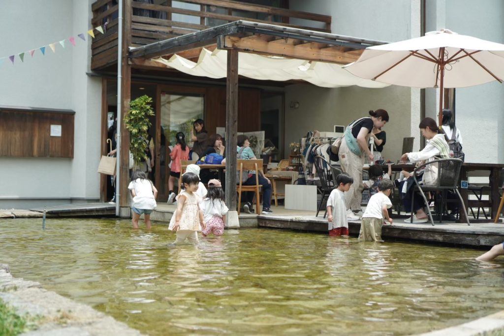 石橋 このお庭は、「飛山濃水(ひざんのうすい)」を表してるんですよ。飛騨の山々、美濃の豊かな川のことで岐阜県の豊かな自然を表す言葉なんですけど、このお庭も、池があってお庭の南側のすこし小高くなってるのが山で、それを表してます。この池は地下70mから組み上げた井戸水が湧いていて、夏は本当に子ども達がパンツ一丁で水遊びをしてます。で、お母さんたちはテラス席でその様子を見守りながらおしゃべりをするような感じになりますよ。