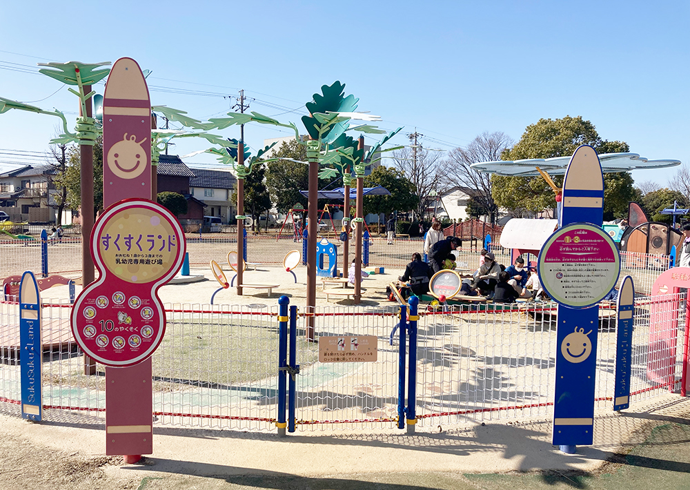 かさまるくん遊具は6~12歳向けの大型遊具ですが、笠松町運動公園には、3~6歳向けの小さめサイズの幼児用遊具も設置されています。また、1~3歳未満児のお子さん専用の遊び場「すくすくランド」が設けられていたりと、幅広い子育て世代に向けて多種多様な遊具が設置されています。