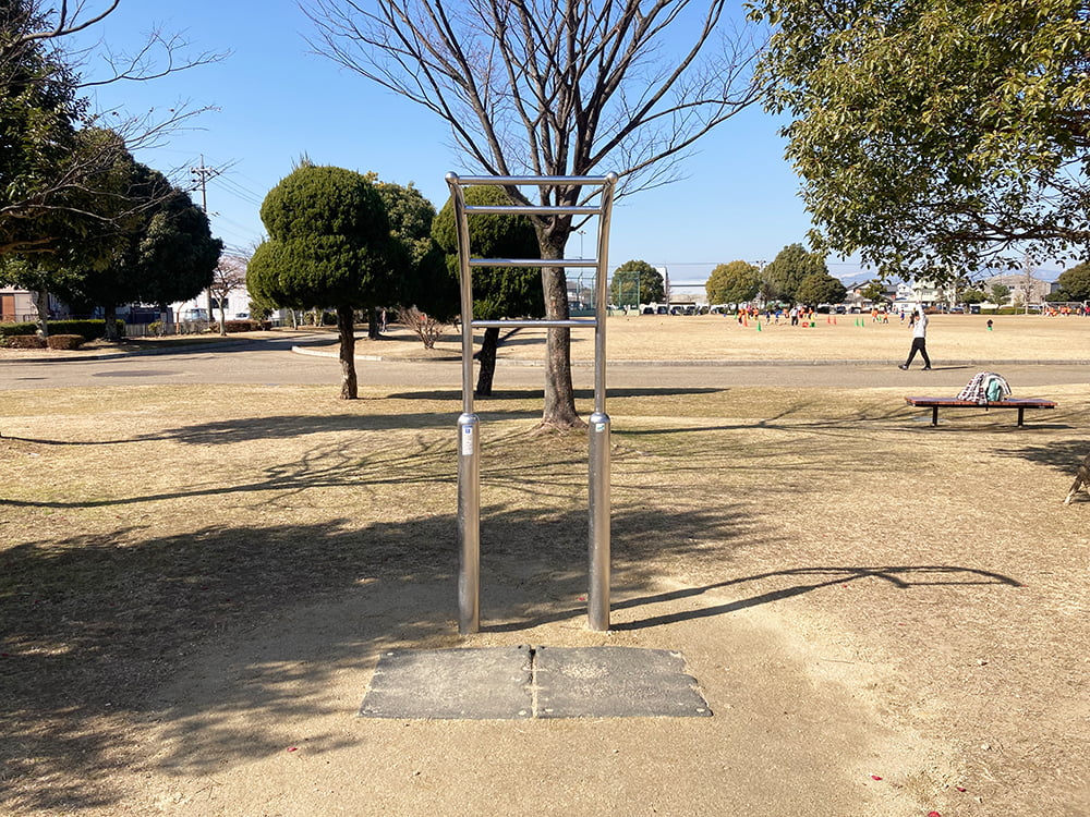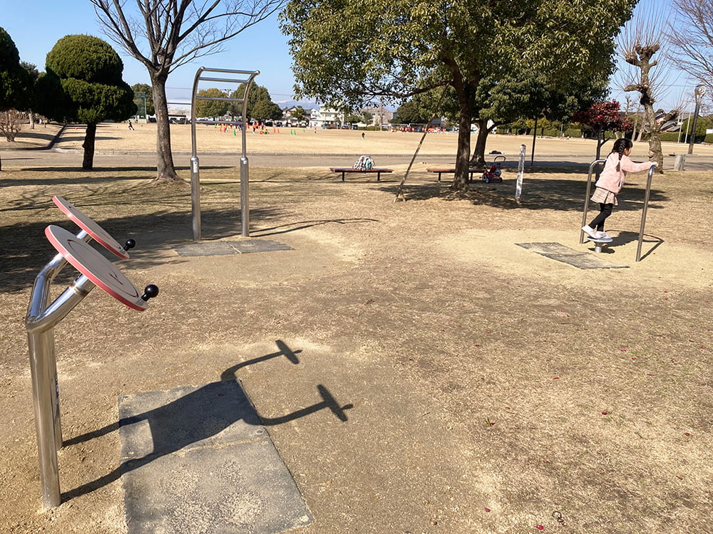 子どもの遊具だけではありません。笠松町運動公園には、大人も体を動かすことを楽しめるストレッチ器具が設置されています。ぶら下がり器具や腰をひねる運動ができる器具など、ウォーキングやジョギングを楽しんだ後はストレッチでクールダウン!