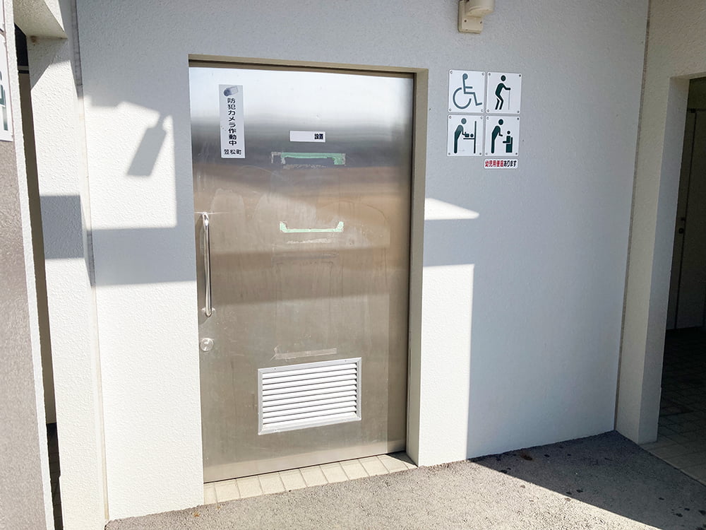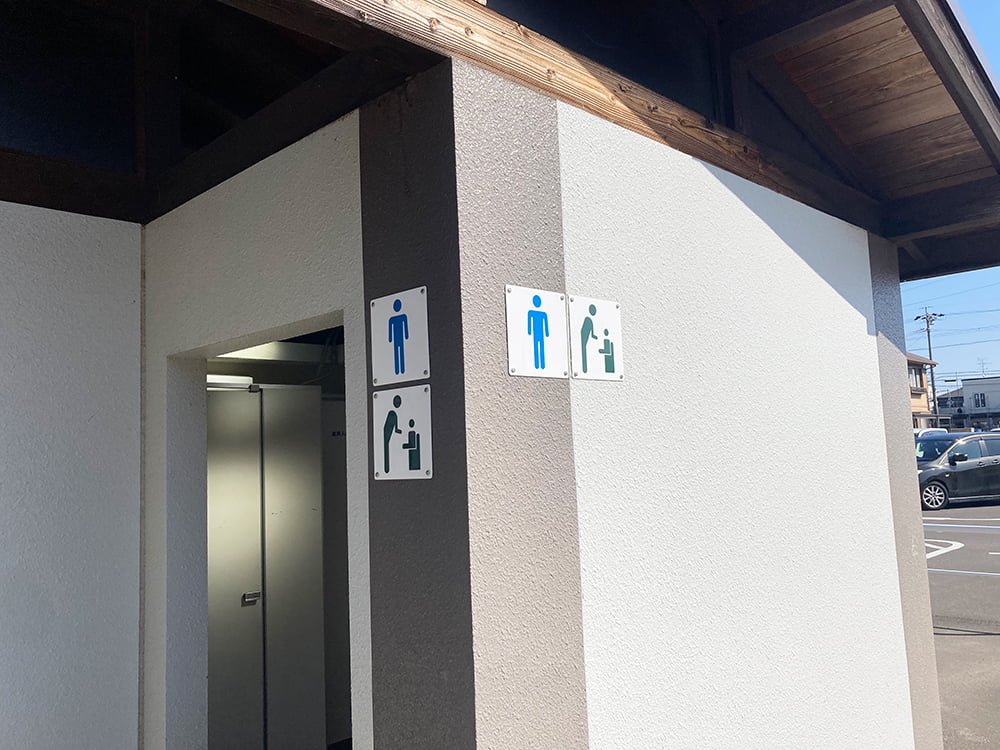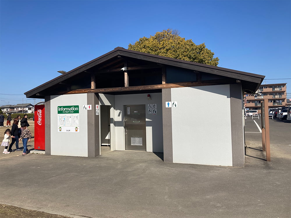 園内には東側遊具エリアに一つ、西側駐車場付近に一つと、2か所のトイレがあります。特に、東側の遊具エリアにある平屋建てのトイレは、男性用、女性用、多目的トイレと充実しています。多目的トイレには、おむつ交換台、幼児便座、ベビーチェアが設置されているので、安心して利用できますね。男性用トイレにもベビーチェアが設置されているのが素晴らしい。
