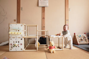 託児ルームは〇畳の和室で広々とした空間です。お部屋にはたくさんの絵本やおもちゃがあります。バウンサーや赤ちゃん用プレイジム、お部屋の真ん中には滑り台、木のおもちゃやレゴなど、対象年齢の生後2か月から就学前までの幅広い年齢層に合わせた多種多様なおもちゃが用意されています。