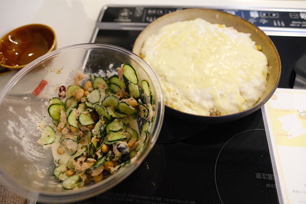 完成した料理を盛り付けます。チーズがのびのび~になるのは楽しい!